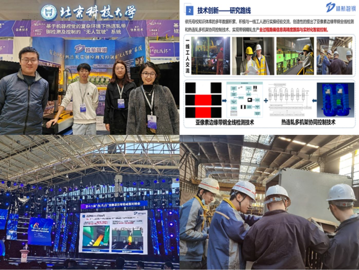 自2020年以來,團隊積極與一線工人進行實操經驗交流,自主設計提出了亞像素邊緣帶鋼全線檢測和熱連軋多機架協同控制兩項關鍵技術,解決了帶鋼在高溫水汽環境檢測難及高速耦合條件下控制模型應用難的問題。模型實現控制頻率50ms,控制精度提升30%;目前已有效應用于馬鋼、鞍鋼兩條熱軋產線,產品投用后甩尾率降低40%,楔形命中率提升15.6%,全線自動化軋鋼率從不到60%提升到90.9%,對實現多機架協同控制,推動熱連軋智能產線目標實現具有重要意義。